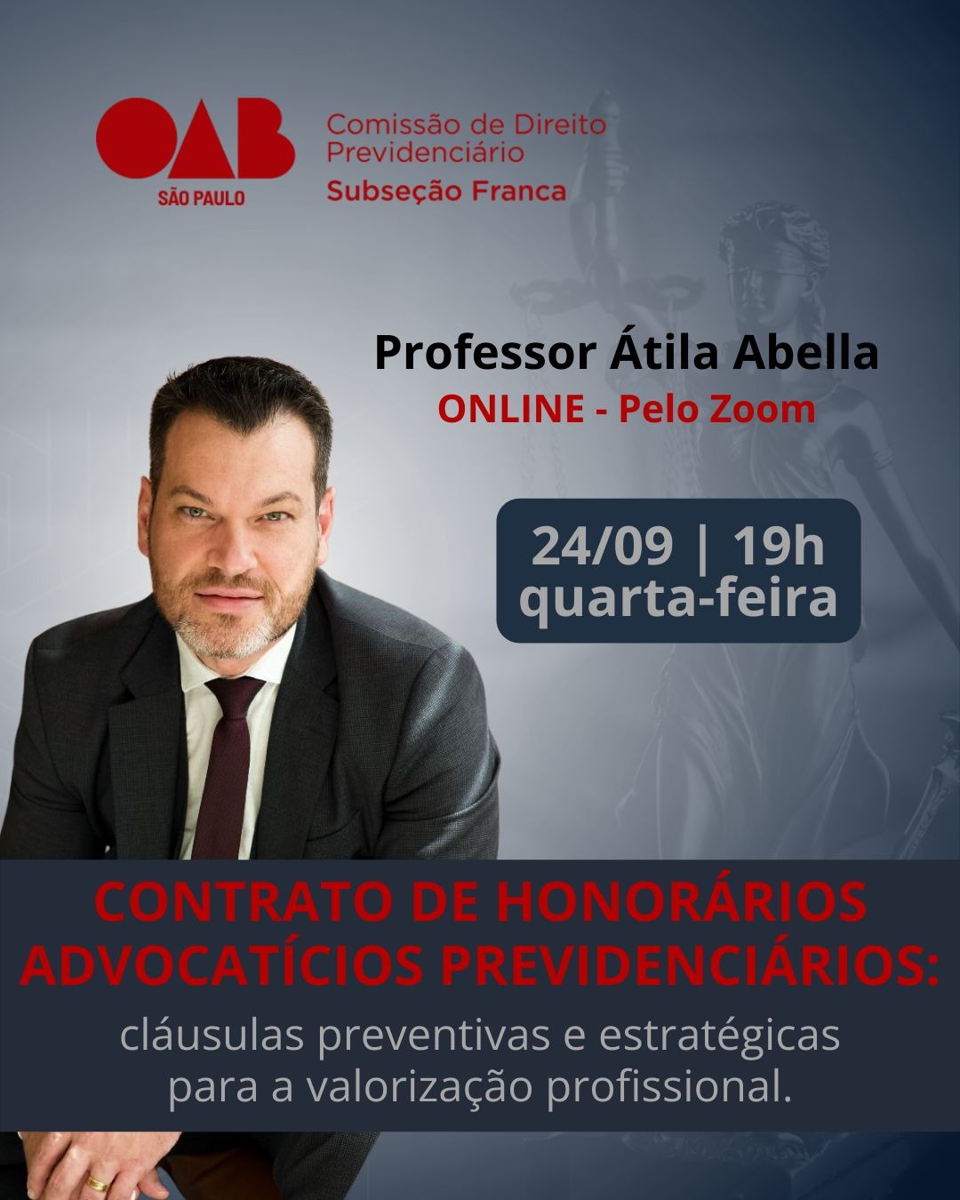 No dia 24/09 (quarta-feira) às 19h, o professor Átila Abella falará sobre as técnicas que utiliza nos seus contratos de honorários para aumentar honorários, facilitar prestação de contas, evitar inadimplência e, caso necessário executar, ter preenchido todos os requisitos para facilitar o recebimento.