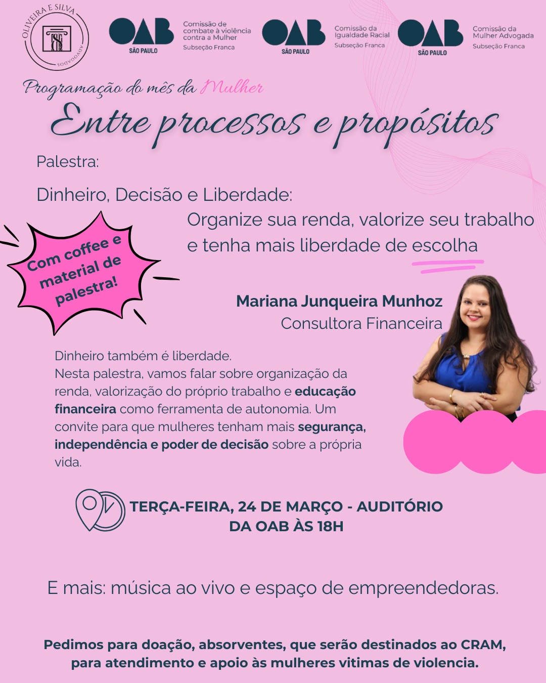 No mês dedicado às mulheres, A OAB Franca, por meio das Comissões de Combate à Violência contra a Mulher, da Igualdade Racial e dada Mulher Advogada, promove um encontro pensado para quem vive muitos desafios, mas também carrega muitos propósitos. A palestra Dinheiro, Decisão e Liberdade vai trazer uma conversa direta sobre organização da renda, valorização do próprio trabalho e educação financeira como ferramenta de autonomia. Quando uma mulher entende e organiza sua vida financeira, ela amplia seu poder de escolha.