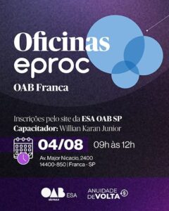 💻 Participe das Oficinas Eproc na OAB Franca!📅 26/08 | 🕖 19h às 22h📍 Av. Major Nicacio, 2400 –...